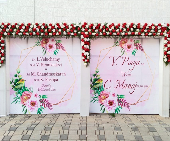 Color Harmony: The chosen flowers, in a palette of [colors], harmonize seamlessly, adding a burst of color that complements your style and surroundings. Personalized Touch: Whether adorning your entryway, living room, or any chosen space, this decoration welcomes guests with a personalized touch that reflects your unique taste. S.Sarangan Flower Shop is the best name board decorators in and around chennai.